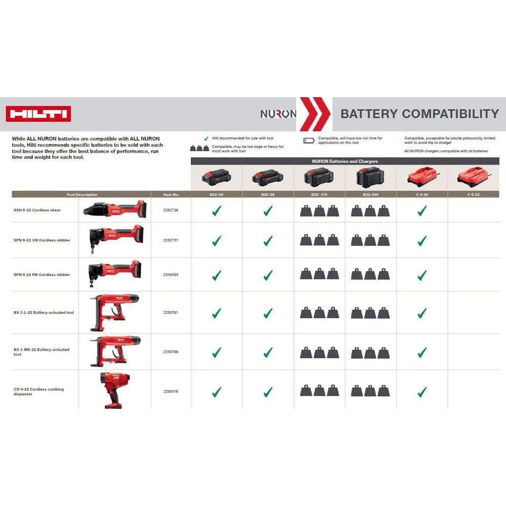 - Hilti recommends NURON battery B22-55 (2251358), B22-85 (2251352) and B22-170 (2251360) to be used with this tool. See compatibility chart for details.