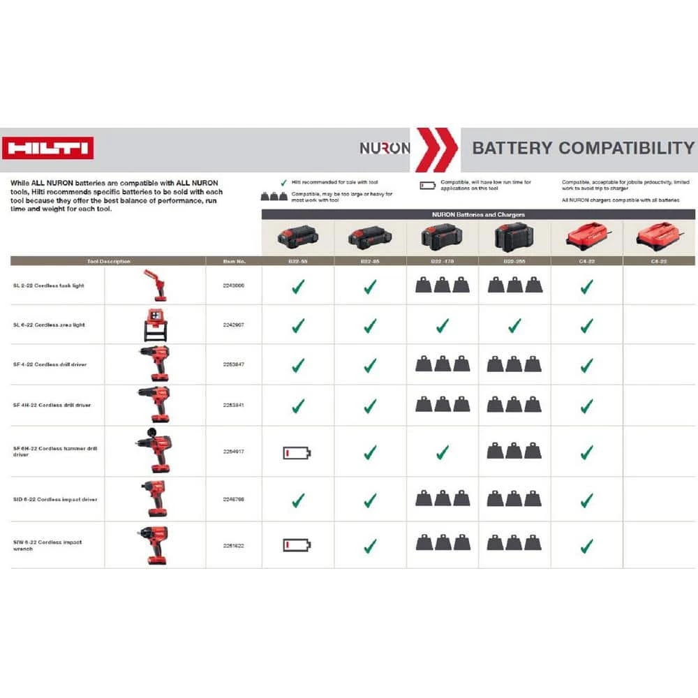 - Hilti recommends NURON battery B22-55 (2251358) and B22-85 (2251352) to be used with this tool, see compatibility chart for details