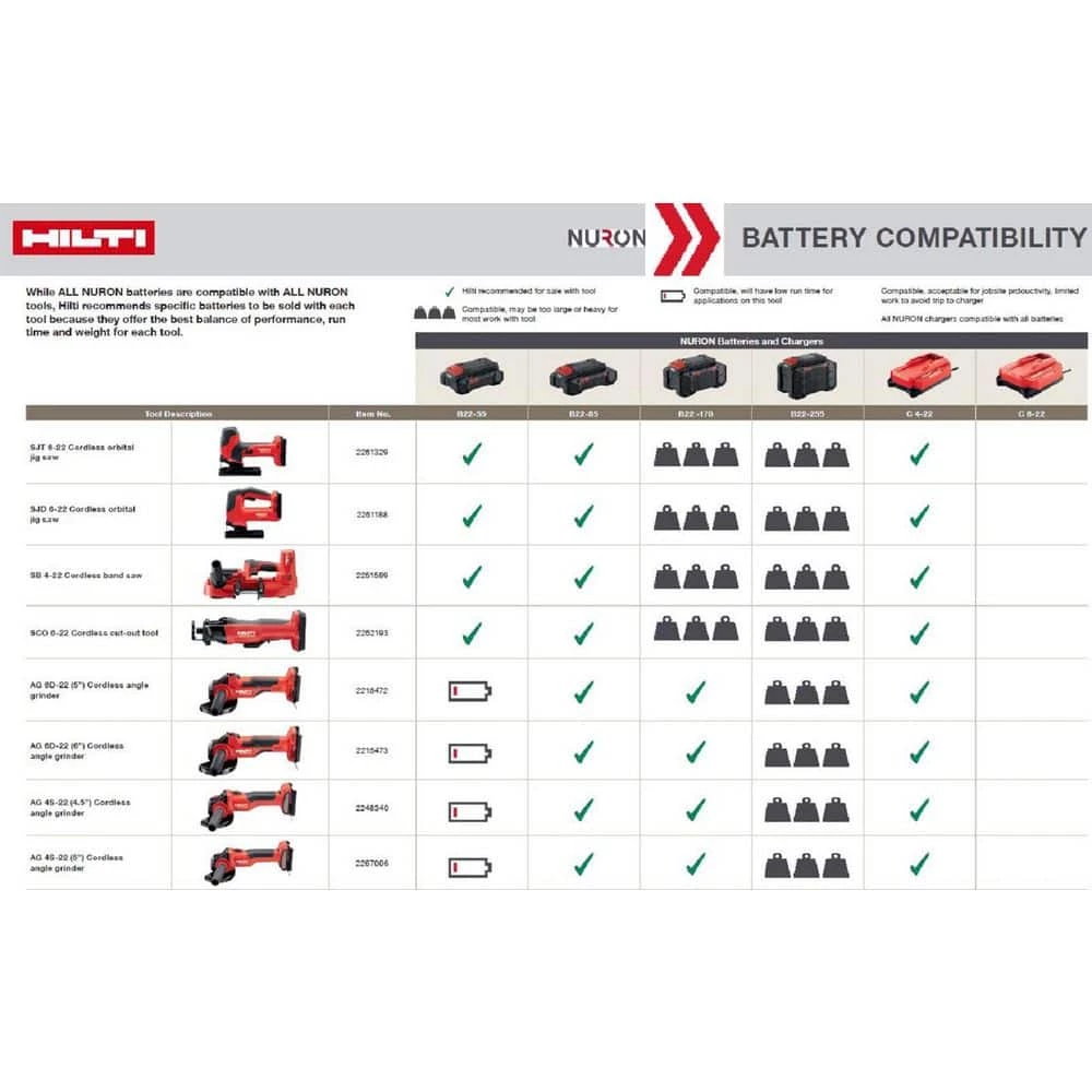 - Hilti recommends nuron battery B22-170 2251360 and B22-255 2345534 to be used with this tool see compatibility chart for details