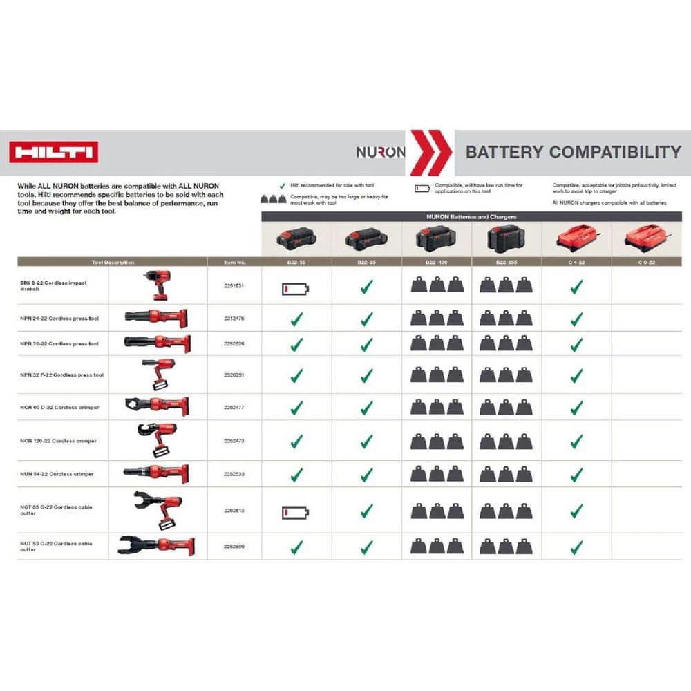 - Hilti recommends NURON battery B22-55 (2251358) and B22-85 (2251352) to be used with this tool. See compatibility chart for details.