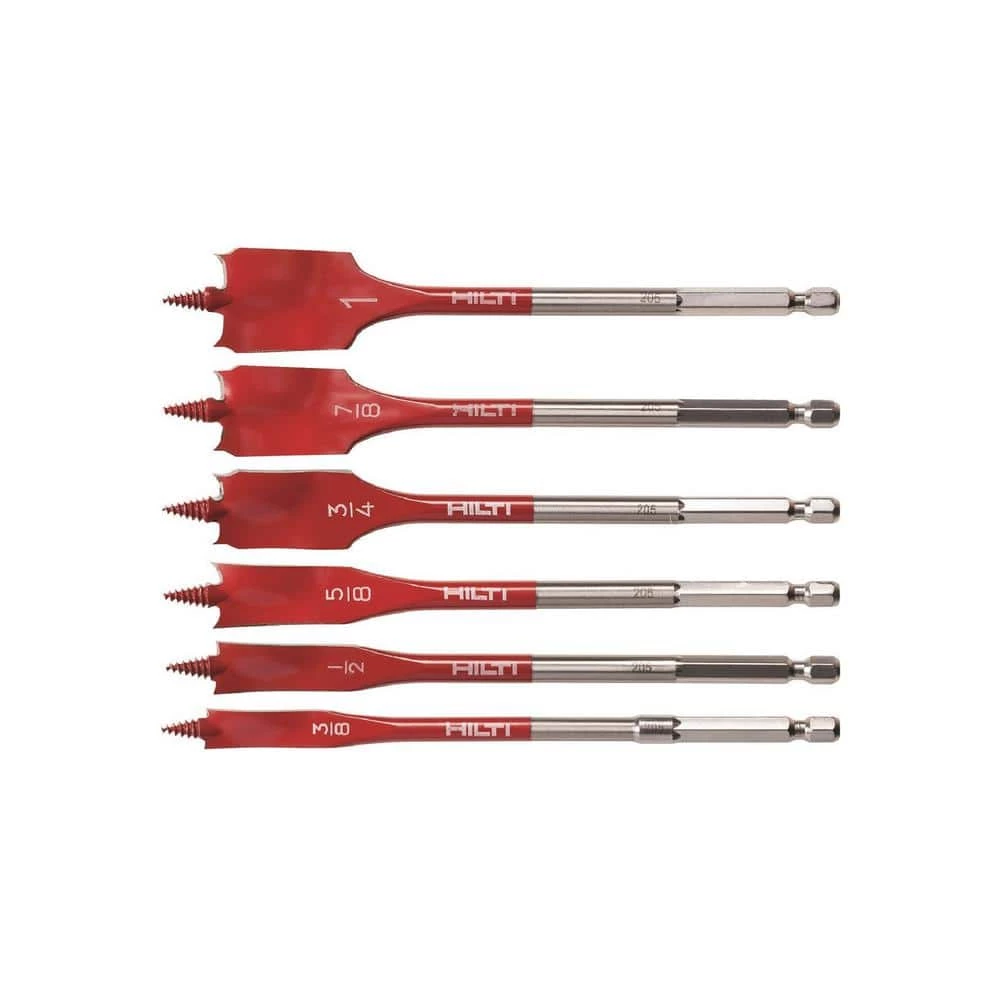 The line of Hilti High Speed Wood Spade Bits drills holes in wood at faster speeds with less effort. The specially designed wing tips and the strong steel bit guarantee the user an easy day of drilling. This pack comes with 6 durable spade bits of different sizes: 3/8, 1/2 in., 5/8 in., 3/4 in., 7/8 in. and 1 in. Get started with your project right away with Hilti’s High Speed Wood Spade Bit pack.