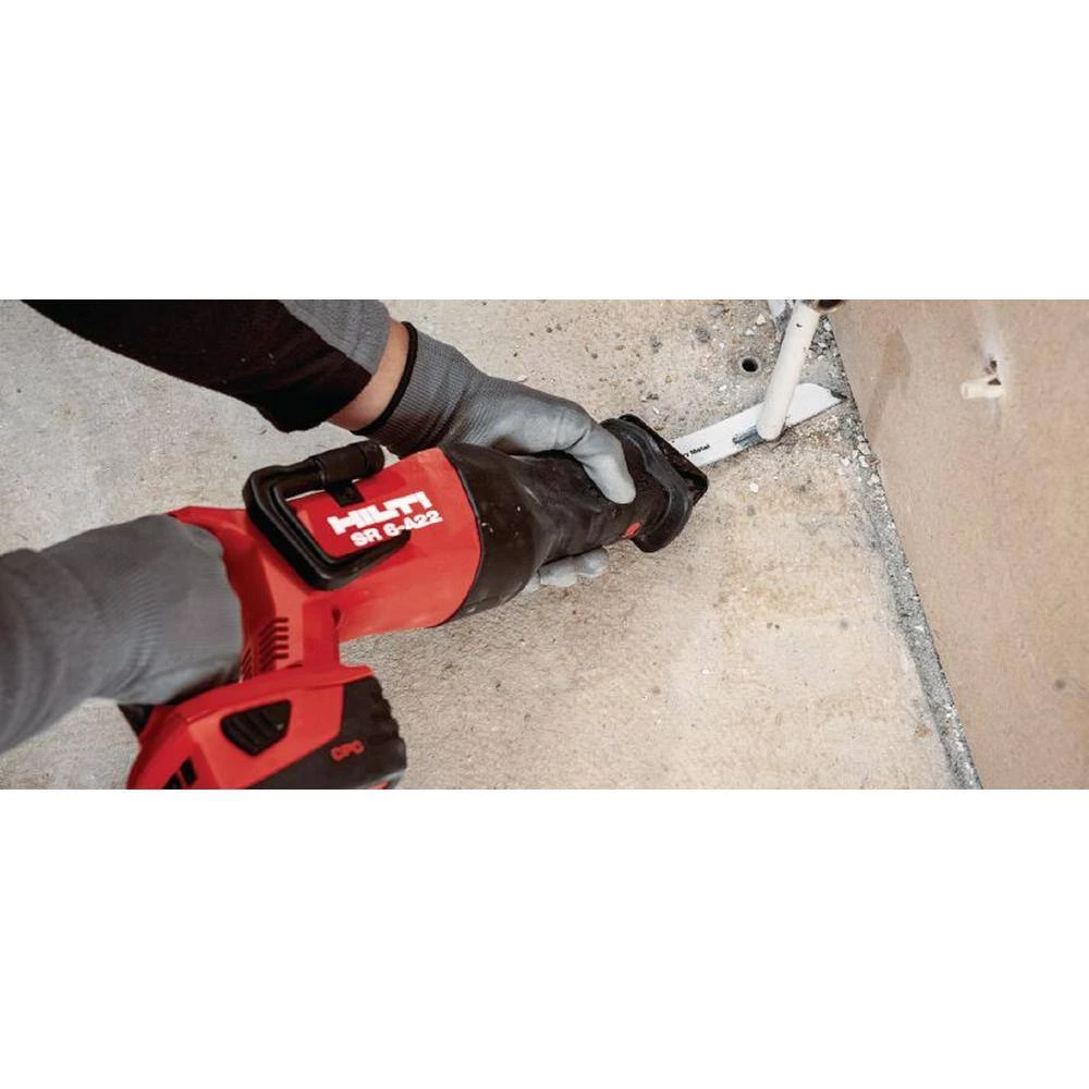 The Hilti SR6 A-22-Volt Lithium-Ion Cordless Reciprocating saw is the tool of choice for professionals who are looking for capacity and durability in a cutting tool. The high efficiency motor and brushless motor of the reciprocating saw, combined with the best battery technology, translates into more applications per charge. It can be used for cutting EMT conduits, galvanized pipes, struts, threaded rods, anchor bolts and rebar; cutting form work, plywood, OSB and 2x material and creating openings in sheet metal, drywall and cement boards. Now you can cut more and cord less with the new Hilti SR6 A-22-Volt Cordless Reciprocating Saw.