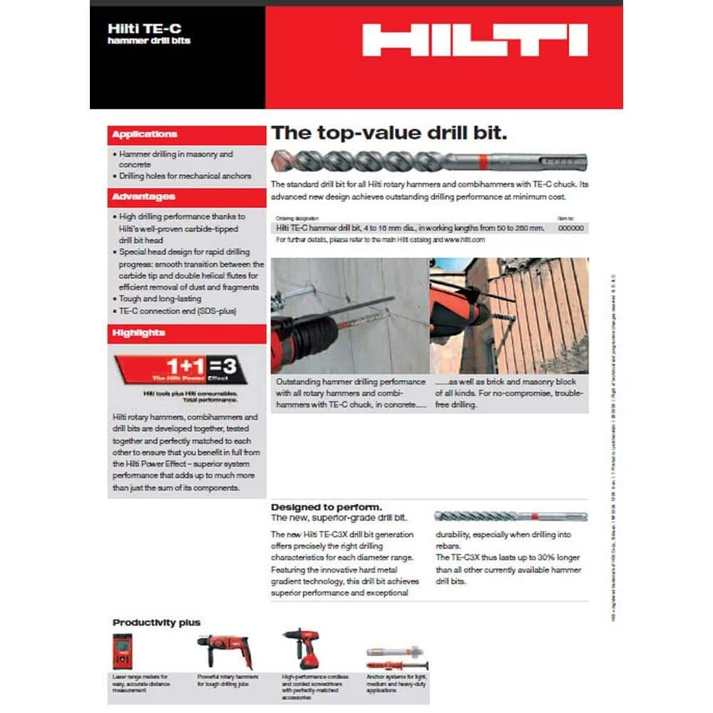 The ultimate in drilling value, the Hilti TE-C line of drill bits raises the industry standard for performance. With its newly designed double fluting and brazed carbide tip, this bit is for professionals who want to get the job done faster, providing outstanding performance at minimum cost. Suitable for use in any TE-C (SDS-Plus) style chuck, the TE-C line of bits was developed to perfectly match Hilti rotary hammers, providing the Hilti Power Effect – superior system performance that adds up to much more than just the sum of its components.