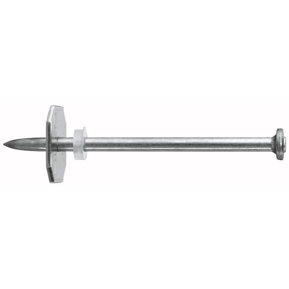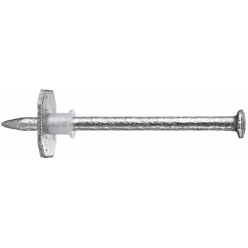 Attach 2×4 lumber to concrete with the Hilti single nails for concrete. These 2-13/16 in. Carbon steel zinc plated nails (20-Pack). These nails offer 23 mm washers and 8 mm plastic guidance washers for accurate attachment. These standard single nails with steel washers are ideal for use with power actuated tool on concrete.
